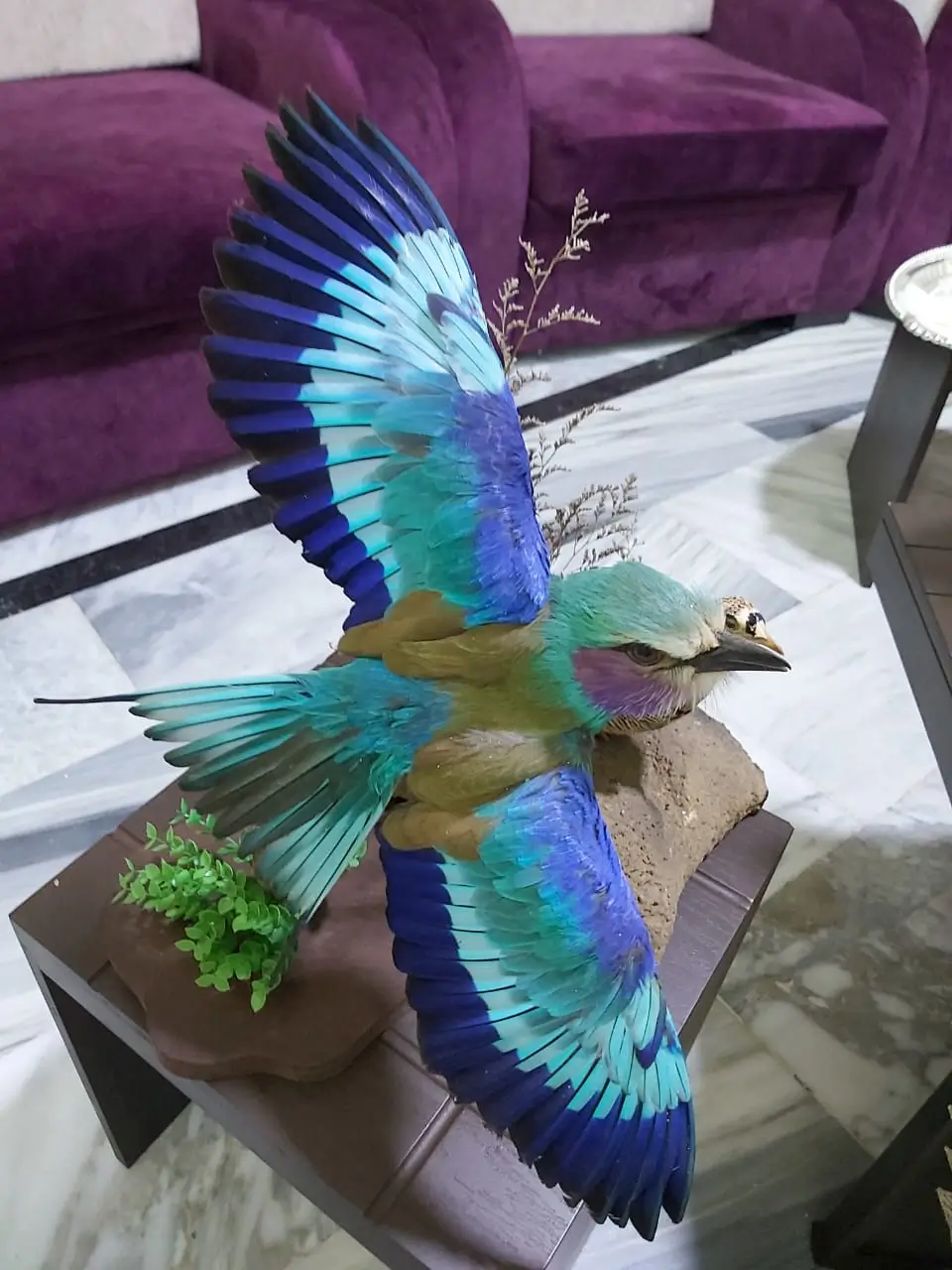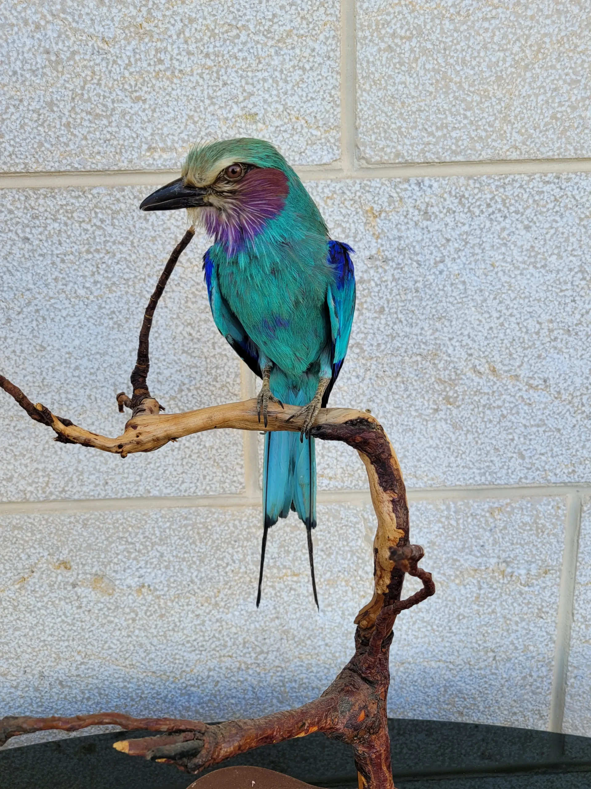 A stunning bird bursting with color — lilac, turquoise, blue, and green. This mount captures its vivid plumage and dynamic posture.