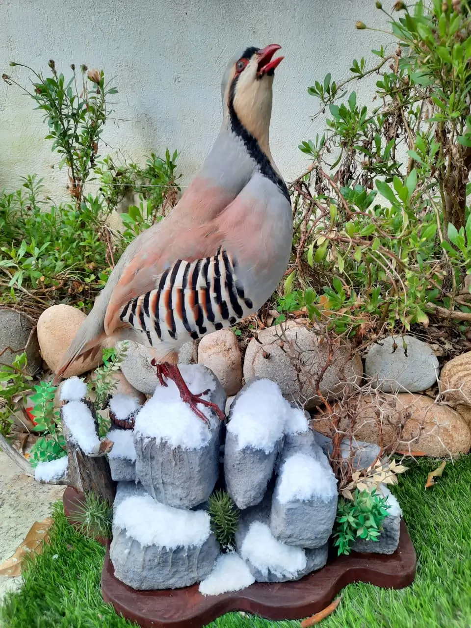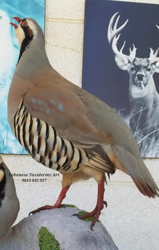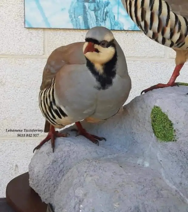 A sturdy, ground-dwelling bird with finely patterned feathers and a bold red beak and legs. This mount displays its compact form and natural alertness.